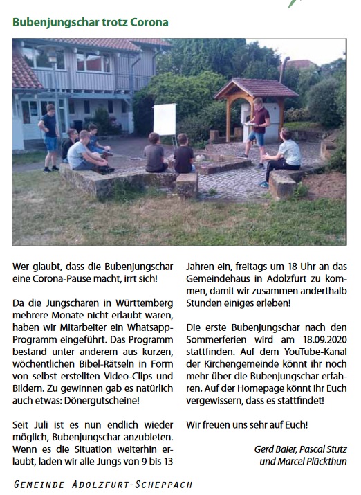 Wer glaubt, dass die Bubenjungschar eine Corona-Pause macht, irrt sich! Da die Jungscharen in Württemberg mehrere Monate nicht erlaubt waren, haben wir Mitarbeiter ein WhatsappProgramm eingeführt. Das Programm bestand unter anderem aus kurzen, wöchentlichen Bibel-Rätseln in Form von selbst erstellten Video-Clips und Bildern. Zu gewinnen gab es natürlich auch etwas: Dönergutscheine! Seit Juli ist es nun endlich wieder möglich, Bubenjungschar anzubieten. Wenn es die Situation weiterhin erlaubt, laden wir alle Jungs von 9 bis 13 Jahren ein, freitags um 18 Uhr an das Gemeindehaus in Adolzfurt zu kommen, damit wir zusammen anderthalb Stunden einiges erleben! Die erste Bubenjungschar nach den Sommerferien wird am 18.09.2020 stattfinden. Auf dem YouTube-Kanal der Kirchengemeinde könnt ihr noch mehr über die Bubenjungschar erfahren. Auf der Homepage könnt ihr Euch vergewissern, dass es stattfindet!Bubenjungschar trotz Corona