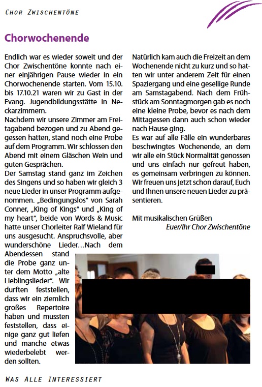 "Zwischentöne" ist der Popchor der ev. Kirchengemeinden Unterheimbach / Geddelsbach und Waldbach / Dimbach.