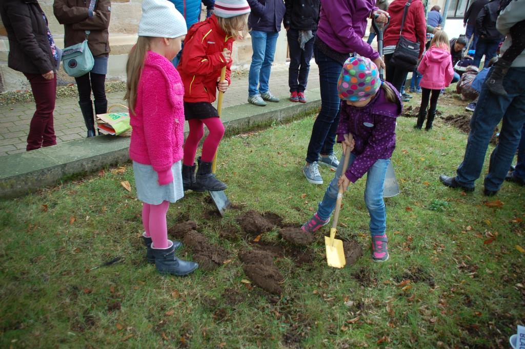 Im Nachgang zum Erntedankgottesdienst, bei dem das Thema Wasser vom Kindergarten thematisch aufbereitet wurde, wurden dieses Jahr als Konfiprojekt und als Nachbereitung des Gottesdienstes zum Tag der Schöpfung mit dem Thema Bienen, 2000 Krokuszwiebeln (1000 Krokus Blumenzwiebeln Gr.5/7 Elfenkrokus Barrs Purple, Weiss-Lila, und 1000 duftende Wild - Krokusse Blumenzwiebeln "Romance" Gr. 5/7, ideal für Bienenfreunde,Gelb ) südlich und östlich der Kirche in den Rasenbeten vergraben. 2000 Zwiebeln hören sich viel an, doch nach einer Stunde waren diese tatsächlich vollständig vergraben.